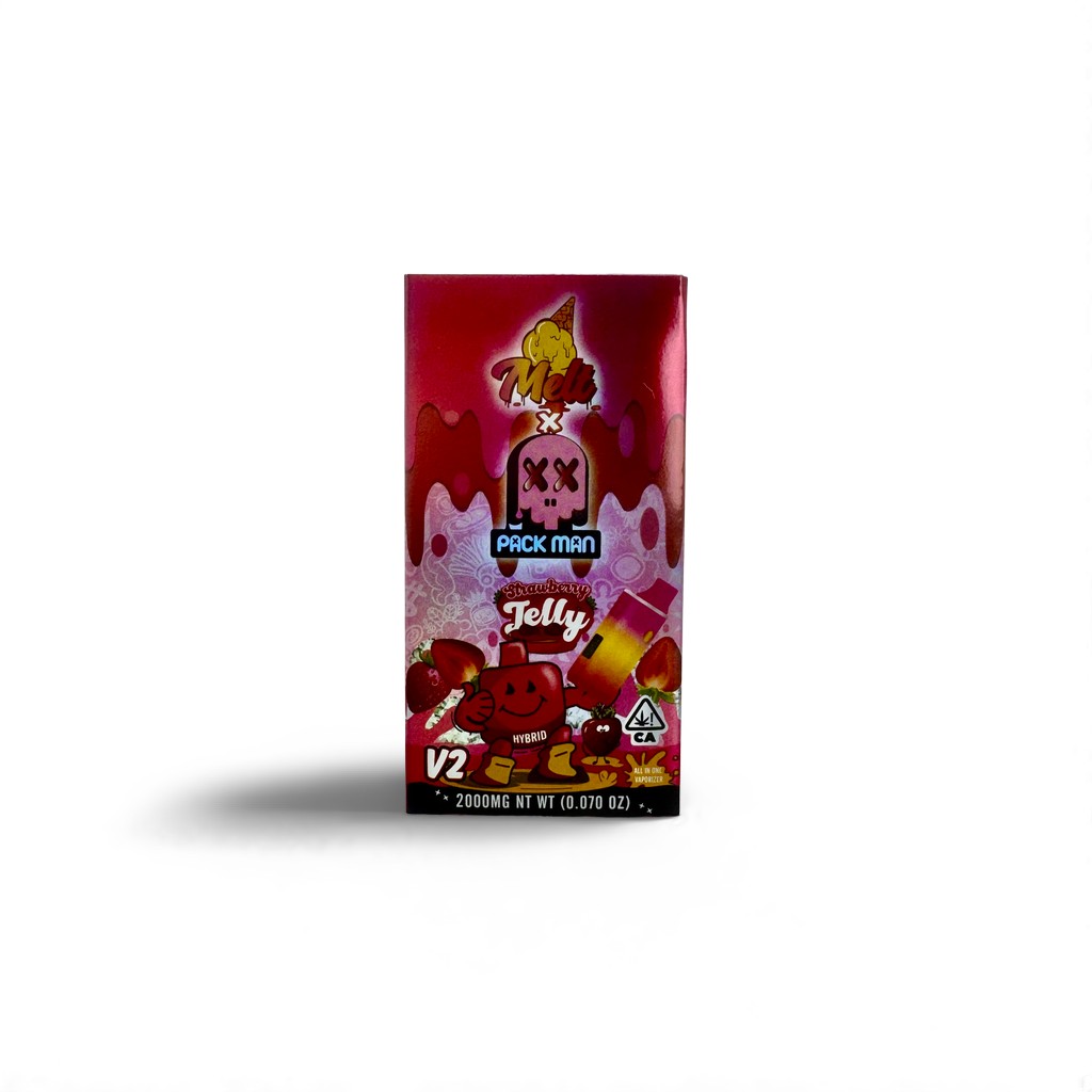 Melt x Pack Man Strawberry Jelly Disposable Vape | Hybrid (2 g) to premium jednorazowy waporyzator THC, który łączy 2 g wysokiej jakości ekstraktu Live Resin + Liquid Diamonds w kompaktowym i wygodnym urządzeniu. Produkt powstał we współpracy marek Melt i Pack Man, oferując wyjątkowy smak, moc oraz płynne działanie bez konieczności ładowania, napełniania czy skomplikowanej obsługi.